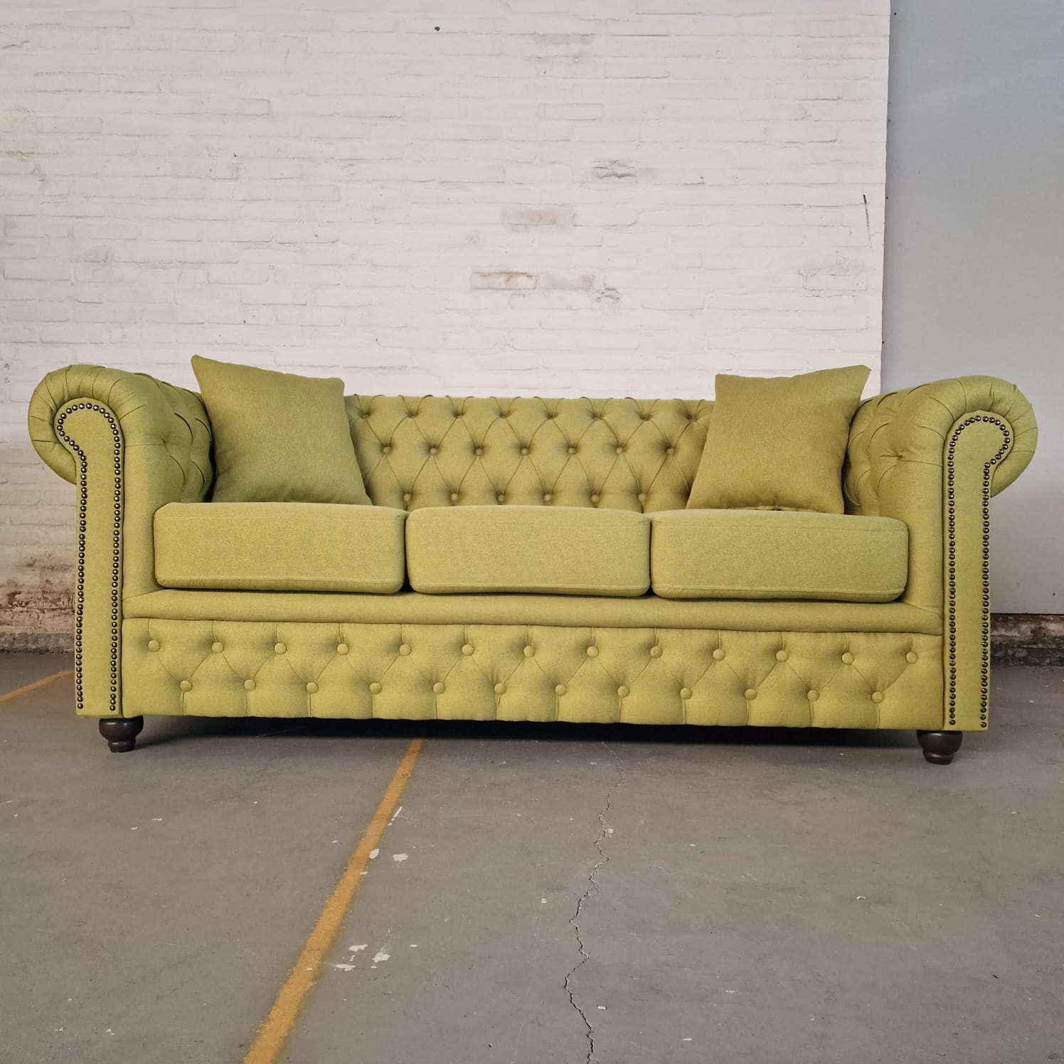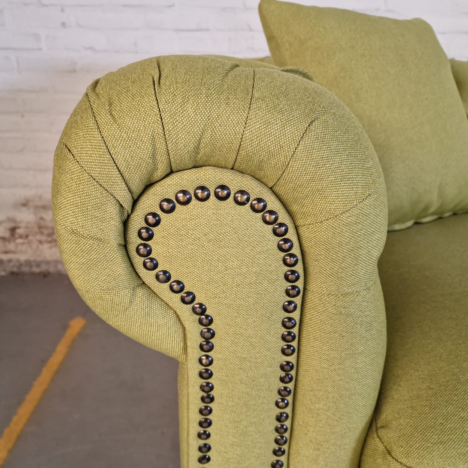 De bank is bekleed met een zachte, duurzame stof, die niet alleen aangenaam aanvoelt, maar ook geschikt is voor dagelijks gebruik. De diepe capitonnering, rolarmen en siernagels geven de bank dat tijdloze karakter, terwijl het felle groen juist zorgt voor een eigentijdse uitstraling die energie uitstraalt.