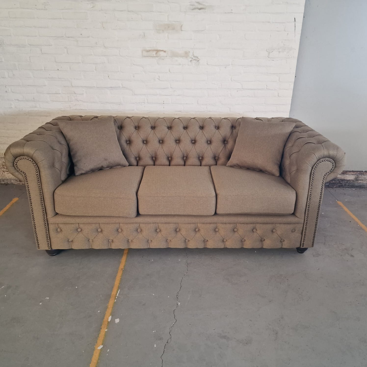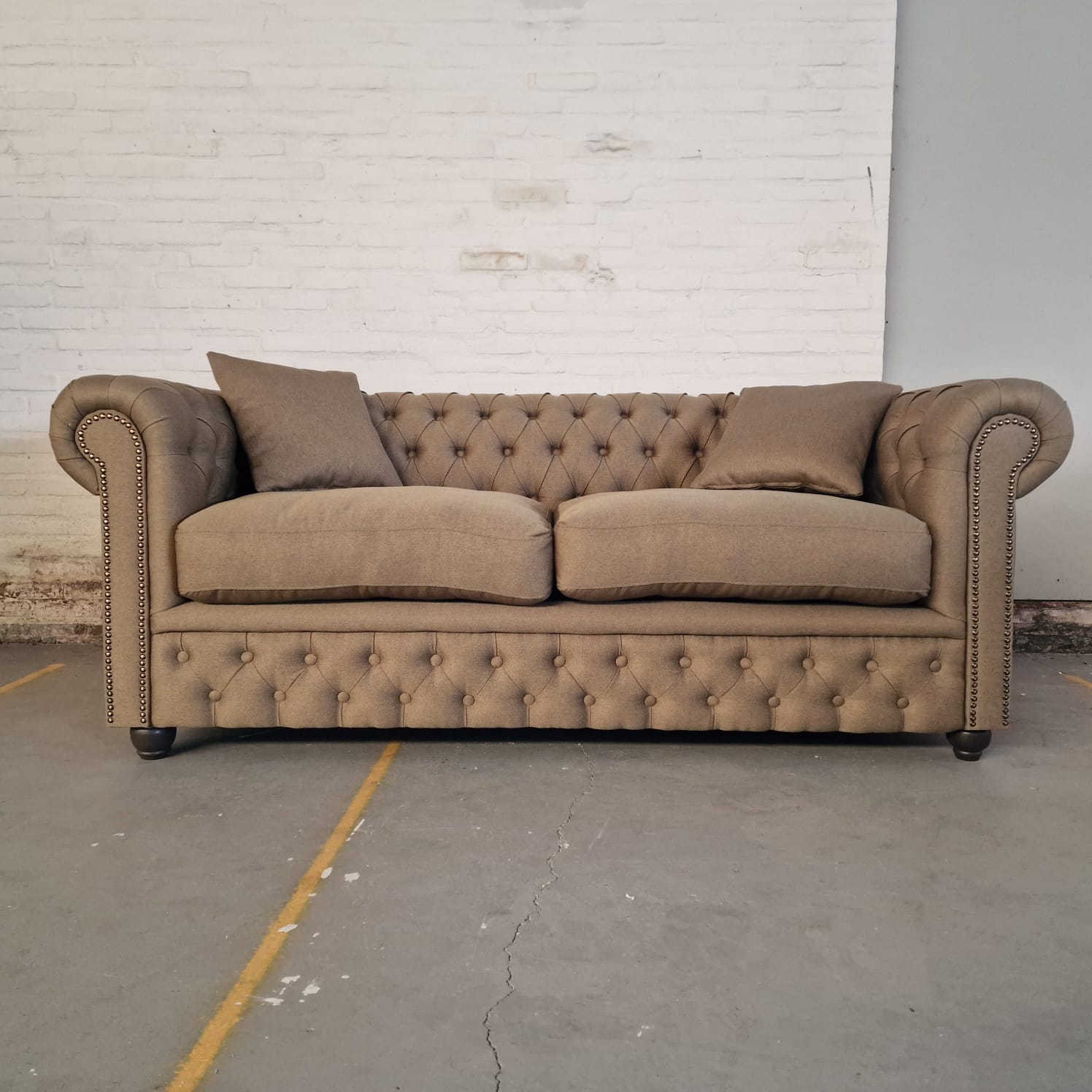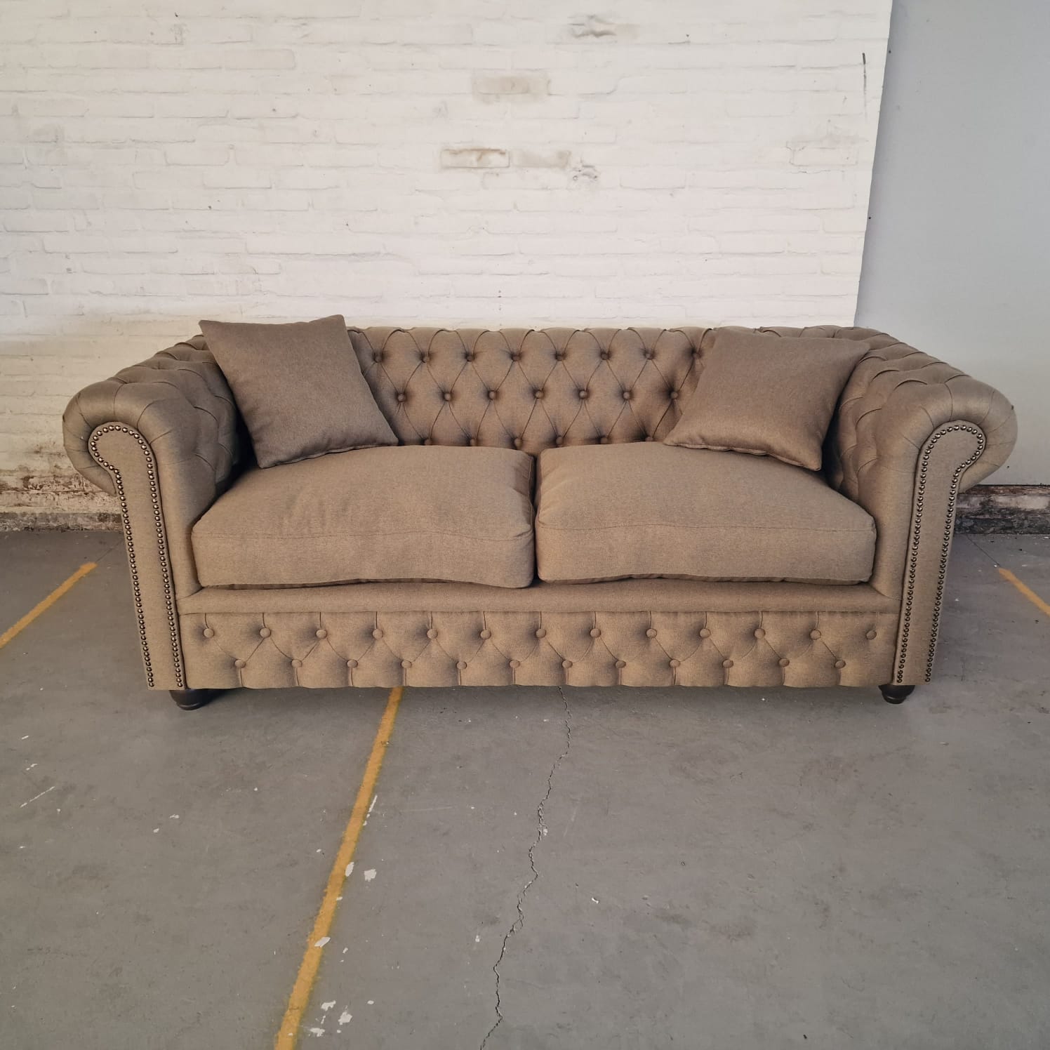 Design: Klassiek Chesterfield met diepe capitonnering, siernagels en rolarmen