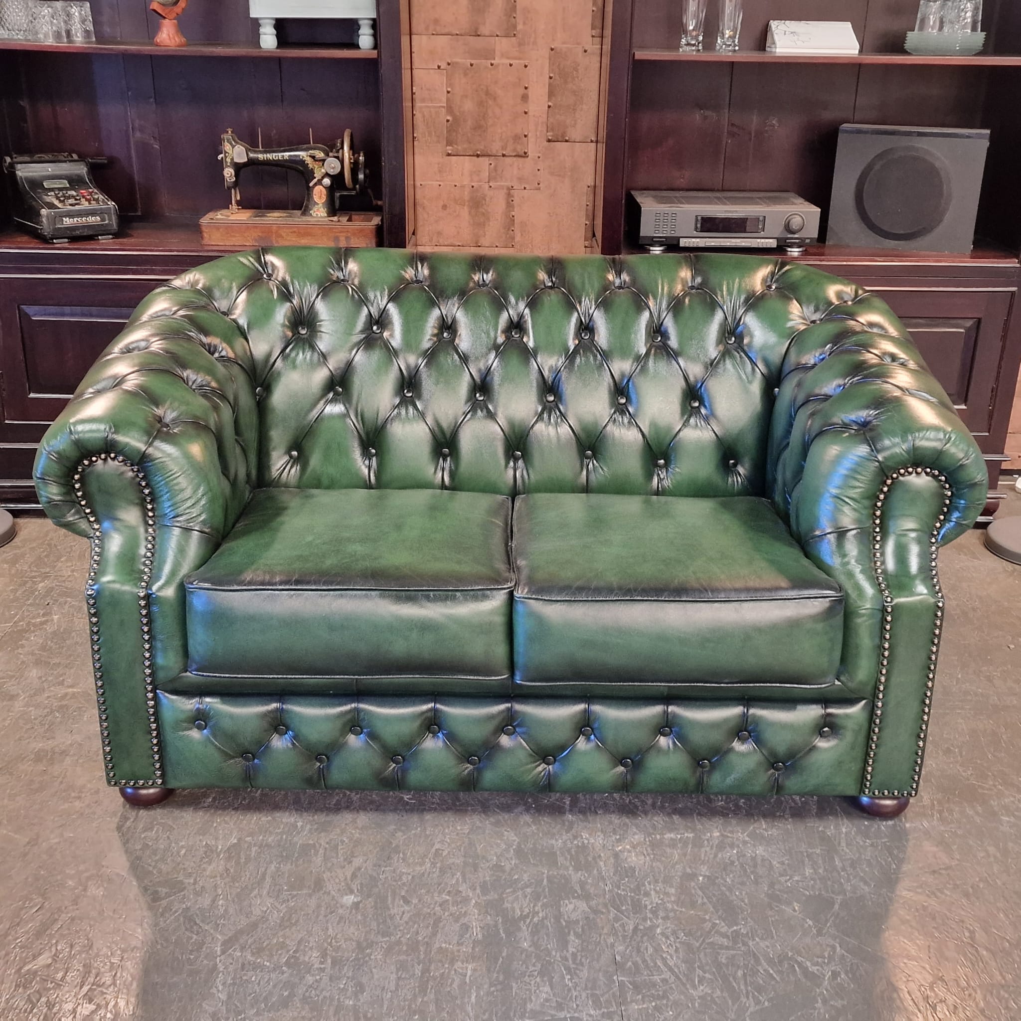 De Chesterfield Charlston 2-zits in antiek groen is een elegante en compacte bank die klassieke Chesterfield-stijl combineert met eigentijds comfort. Met zijn handgeknoopte capitons en sierlijke rolarmleuningen straalt deze bank luxe en tijdloze charme uit.