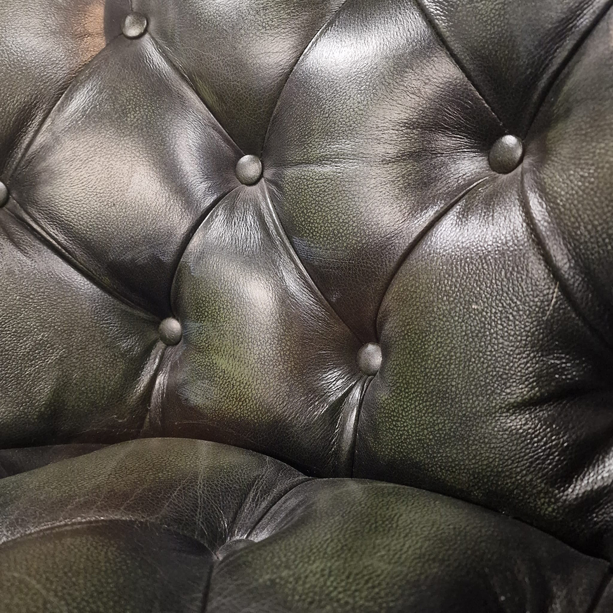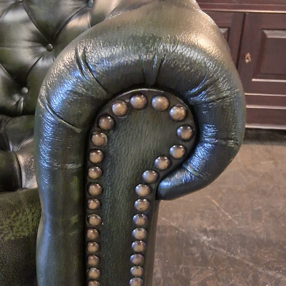 De Chesterfield Club Chair in antiek groen is een elegante fauteuil die klassieke Chesterfield-elegantie combineert met royaal comfort. Vervaardigd uit hoogwaardig leder en voorzien van handgeknoopte capitons en sierlijke rolarmleuningen, straalt deze stoel luxe en tijdloze stijl uit.