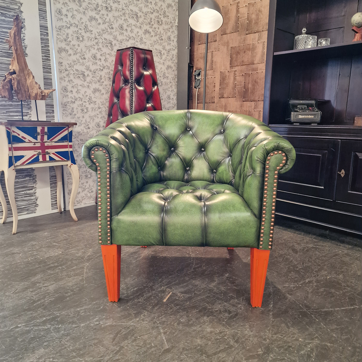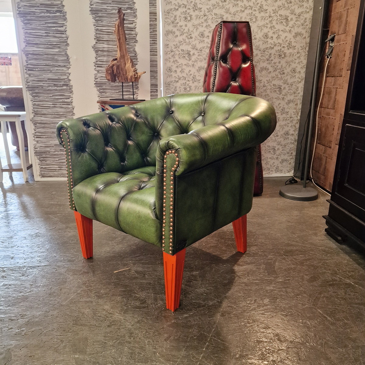 Een compact icoon vol karakter: de Chesterfield Club Chair met button seat in Antique Green is een klassieke fauteuil met een warme, verfijnde uitstraling. Diep capitonneerwerk op de rugleuning, armleuningen en zitting geeft deze stoel zijn kenmerkende Chesterfield-silhouet en ambachtelijke afwerking.