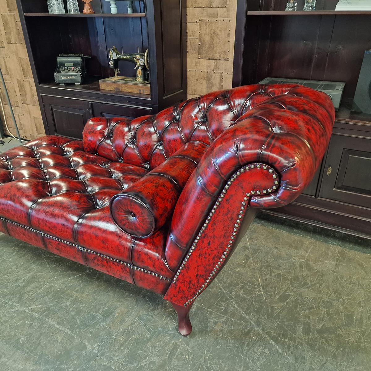 Hoogwaardig, echt leer in antiekrood Iconisch Chesterfield-knopwerk en rolarmen Royale zit- en ligruimte Stevige houten poten Tijdloos design met vintage charme