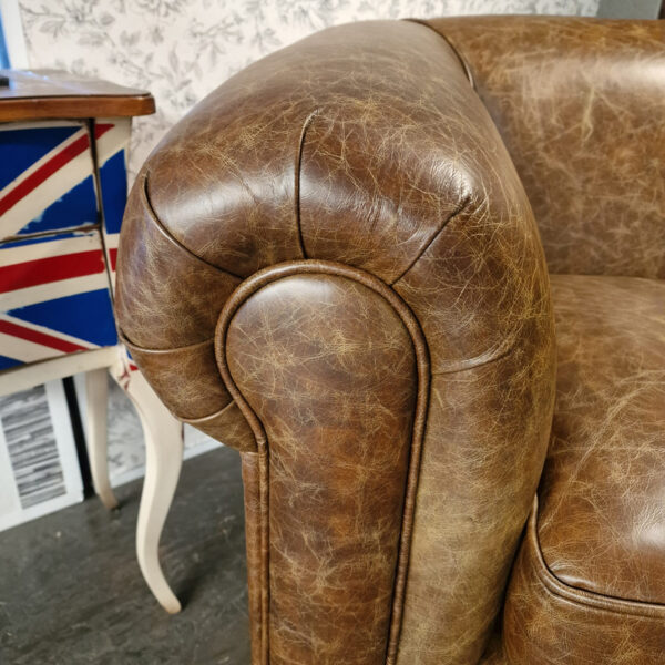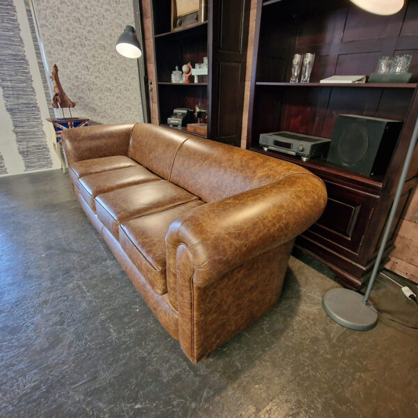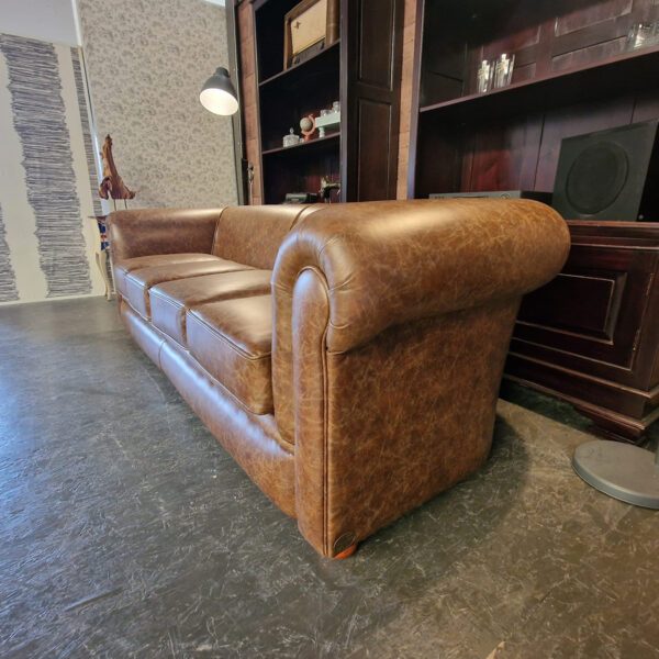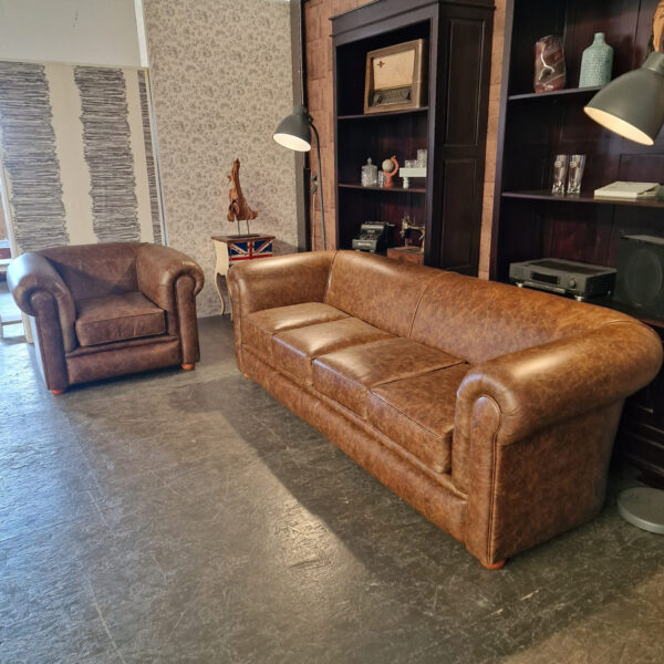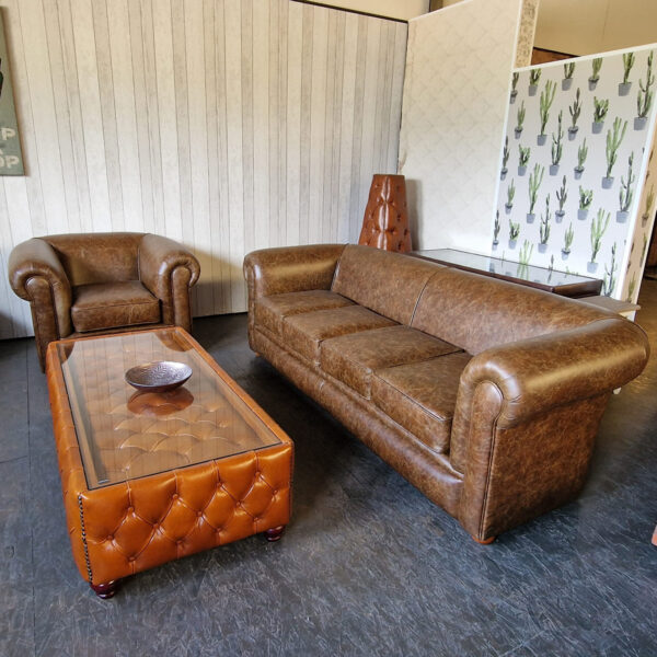 Without the traditional deep buttoning, this set exudes a sleek, contemporary elegance, while the distinctive rolled armrests and luxurious finish preserve the timeless Chesterfield character.
