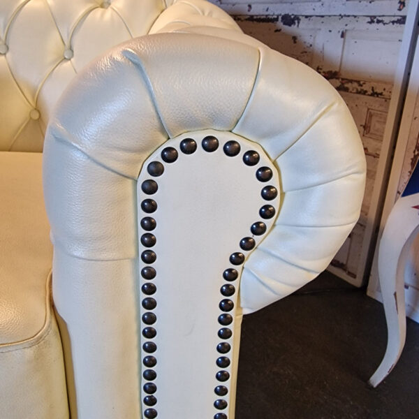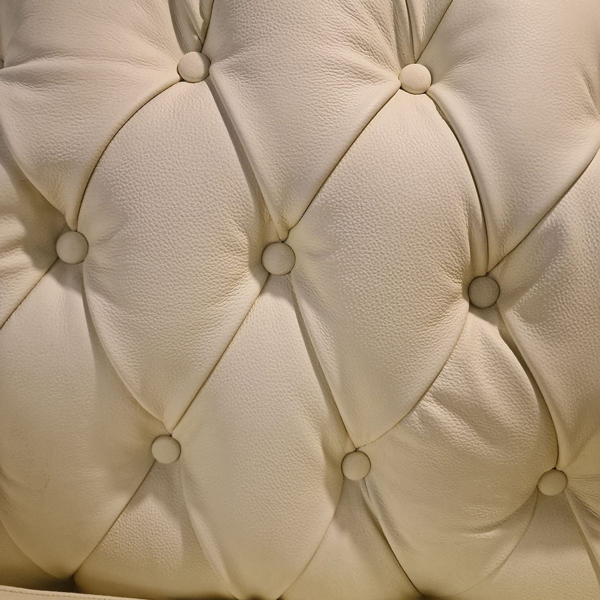 Each armchair features the signature deep-buttoned backrest, gracefully rolled arms, and hand-finished stud detailing – all crafted with attention to tradition. The smooth, high-quality leather in Crème White adds a sense of understated luxury, creating a bright and refined atmosphere in any room.