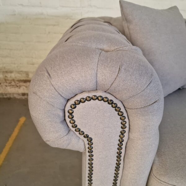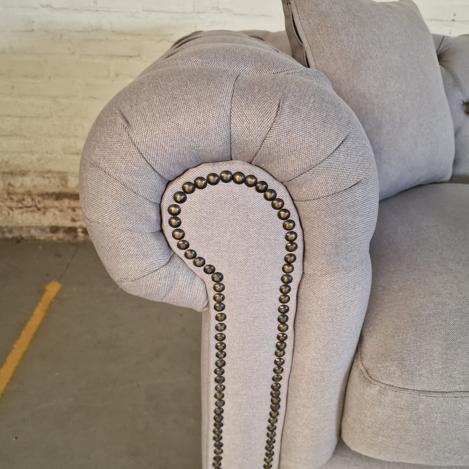The sofa is upholstered in a soft, high-quality fabric that feels pleasant to the touch while being durable enough for everyday use. The signature deep button tufting, rolled arms, and decorative studs deliver that authentic Chesterfield look, while the light grey colour scheme offers a calm, contemporary feel.